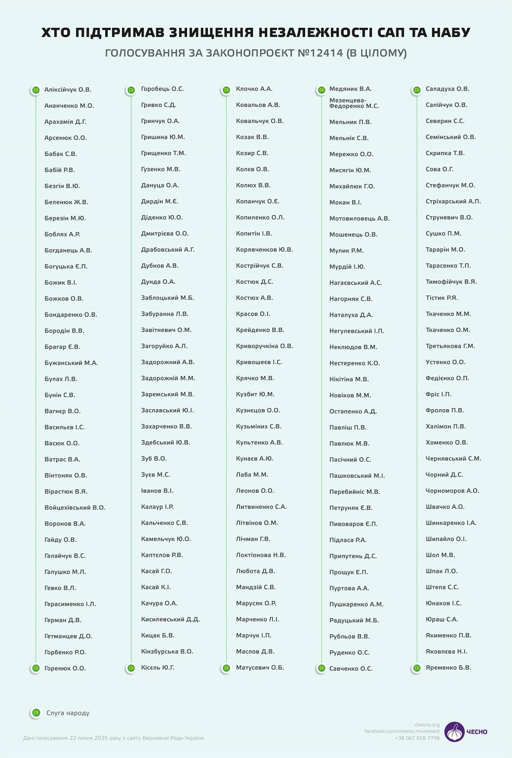 «Народные депутаты во вторник, 22 июля, поддержали закон №12414, который фактически уничтожает независимость САП и НАБУ. «За» проголосовали 263 избранника. Больше всего голосов «за» дали фракция «Слуги народа» (185), также их поддержали большинство депутатов из «ПЗЖМ» (18), «Доверия» (17), «Батькивщины» (15), «За будущее» (10) и «Восстановление Украины» (9). Кроме того, три голоса «за» дала «Европейская солидарность», один — «Голосу», и еще пять — внефракционные и среди них спикер Руслан Стефанчук и Марьяна Безуглая, которая уже опубликовала пост, в котором заявила, что имеет честь быть в списке.