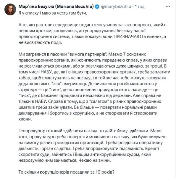 «Генпрокурор готов осуществить надзор, то дайте ему осуществить. Мало того, прокуратуре надо возвращать возможности надзора, которые были изъяты по требованию различных общественных организаций. Надо разделять оперативную деятельность и орган следствия. Надо упорядочивать подследственность. Наконец сократить суды, заняться и Высшим антикоррупционным судом, который непонятно чем занимается. Жду изменений», — написала также Безуглая, объясняя, почему отдала свой голос «за».